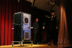 ★人体交換 頑丈な箱にアシスタントの女性を入れます。 しっかりロックし、更に南京錠までかけます。脱出不可能な箱の上に マジシャンは立ち、布を投げた次の瞬間、箱の上のマジシャンは消え、 閉じ込められたはずのアシスタントが箱の上に立っています。 瞬間の変化に観客は目が点になることでしょう。 ●マジシャン1名 ●アシスタント1名 |